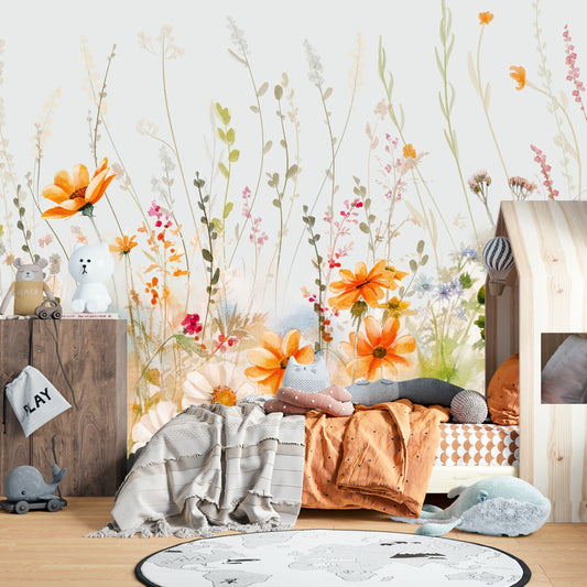 Turuncu Kır Çiçekleri Çocuk Odası Duvar Kağıdı